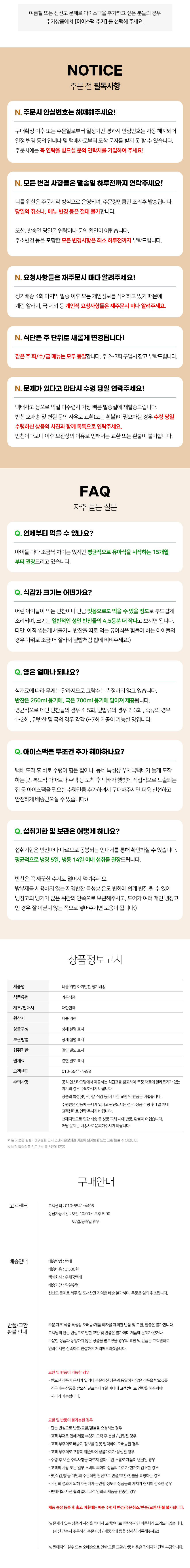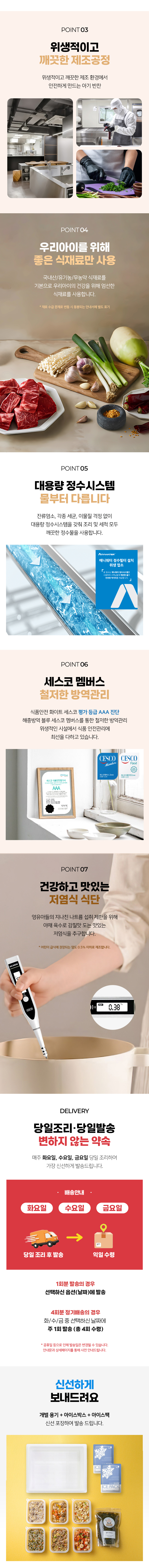 방부제가 포함되지 않은 저염반찬 특성상 소비기한 이내라도 쉽게 변질될 수 있으므로, 최대한 빠른 소비 권장드립니다.